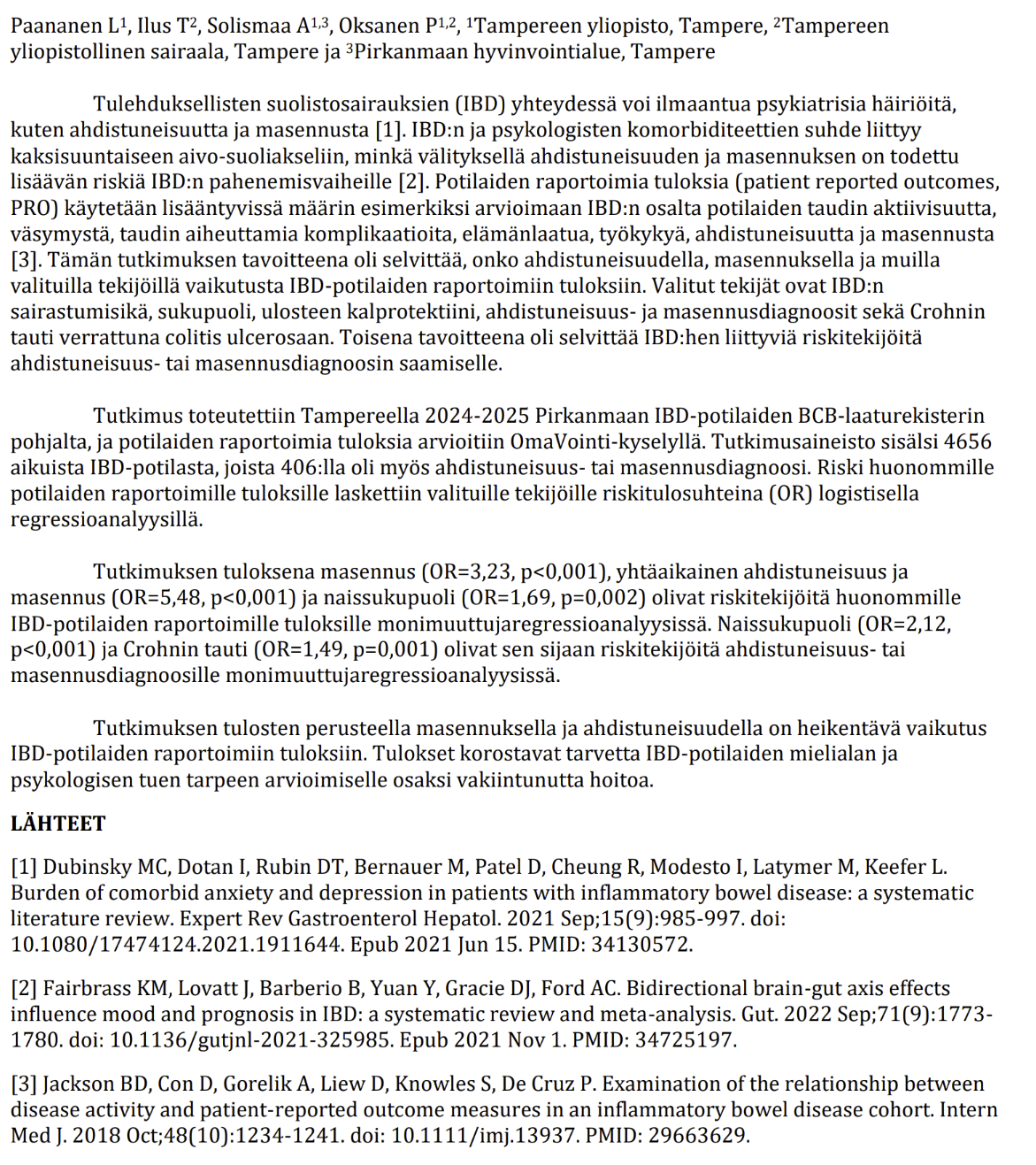 MASENNUS JA AHDISTUNEISUUS ENNUSTAVAT HUONOMPIA POTILAIDEN RAPORTOIMIA TULOKSIA IBD-POTILAILLA
