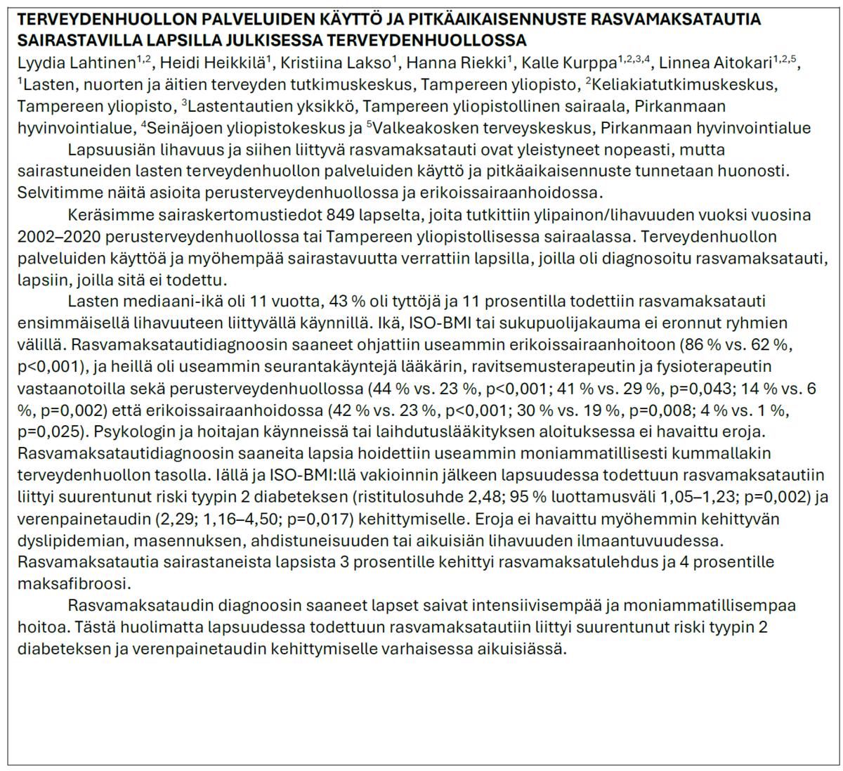TERVEYDENHUOLLON PALVELUIDEN KÄYTTÖ JA PITKÄAIKAISENNUSTE RASVAMAKSATAUTIA SAIRASTAVILLA LAPSILLA JULKISESSA TERVEYDENHUOLLOSSA